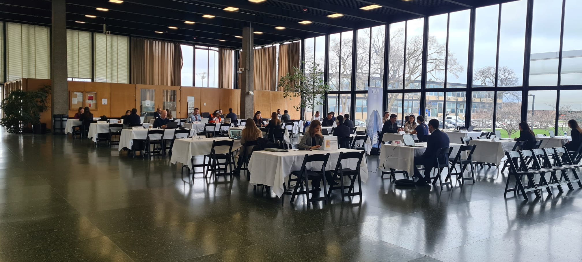 The fair focuses on individual interviews. Each company has a large table for information and interviews.